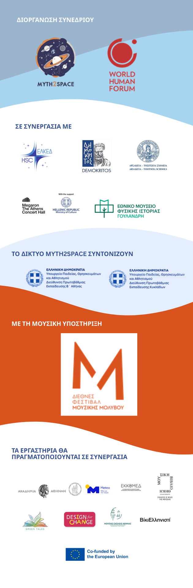 Το συνέδριο διοργανώνουν το Διεθνές Δίκτυο Εκπαίδευσης για την Αειφορία «Από τη Μυθολογία στο Διάστημα – Myth2space» και το World Human Forum, σε συνεργασία με το Ελληνικό Κέντρο Διαστήματος, το ΕΚΕΦΕ «Δημόκριτος», τη Φιλεκπαιδευτική Εταιρεία (Αρσάκεια – Τοσίτσεια Σχολεία), το Μέγαρο Μουσικής Αθηνών και Εθνικό Μουσείο Φυσικής Ιστορίας Γουλανδρή.