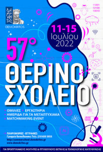 Το Θερινό Σχολείο επιστρέφει φέτος στο Δημόκριτο. Μετά από δύο χρόνια διαδικτυακών διοργανώσεων, το 57ο Θερινό Σχολείο επιστρέφει δια ζώσης στις εγκαταστάσεις του Εθνικού Κέντρου Φυσικών Επιστημών Δημόκριτος από 11 έως 15 Ιουλίου 2022.