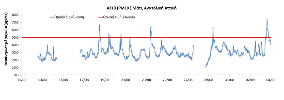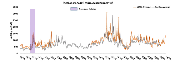 Από τα αποτελέσματα των μέσων τιμών του Πίνακα 1 συνάγεται ότι τα επίπεδα των 24ωρων συγκεντρώσεων των ΑΣ10 είναι αυξημένα σε σχέση με το υπόβαθρο του λεκανοπεδίου Αττικής αλλα παραμένουνν πολύ χαμηλότερα των οριακών τιμών που προβλέπονται από τη νομοθεσία.Από τα αποτελέσματα της ωριαίας διακύμανσης των ΑΣ10 συμπεραίνεται ότι οι αυξημένες συγκεντρώσεις οφείλονται σε επιβάρυνση που δημιουργειται τις ώρες 8:00 -17:00 όταν διεξάγονται εργασίες που επιτείνουν την επαναιώρηση σκόνης και υπολειμάτων της καύσης από το έδαφος ή τα υλικά. Τα επίπεδα αιθάλης είναι φυσιολογικά και συγκρίσιμα με αυτά του αστικού υποβάθρου. Η ωριαία διακύμανση μας επιτρέπει να αποδώσουμε τις παρατηρούμενες εξάρσεις σε καπνό από άλλες πυρκαγιές και παρατηρούνται ταυτόχρονα στα 2 σημεία μετρήσεων.