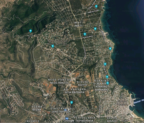 Επιλέχθηκαν συνολικά πέντε σημεία δειγματοληψίας: Ιερός Ναός Αναλήψεως Σωτήρος 38°01’19.15’’N/23°58’59.28’’E, Λύρειο Ίδρυμα 38°02’45.28’’N/23°58’02.30’’E, Ιερός Ναός Κοιμήσεως Θεοτόκου 38°02’49.36’’N/23°59’35.43’’E, Οικία στο Κόκκινο Λιμανάκι 38°01’45.52’’N/24°0’0.10’’E και ΚΑΑΥ Αγίου Ανδρέα 38°03’27.14’’N/23°59’40.29’’E. Οι δειγματοληψίες διεξήχθησαν από 27/8 έως 1/9/2018. Επιπρόσθετα, από τις 10/8 έως τις 5/10/2018 ο Δημόκριτος εγκατέστησε στο Μάτι Αττικής, σε απόσταση 150 μέτρων από την ακτή (38° 2′ 36.27″N/23° 59′ 58.91″E), εξοπλισμό δειγματοληψίας και όργανα συνεχούς καταγραφής και μέτρησης ατμοσφαιρικών παραμέτρων.