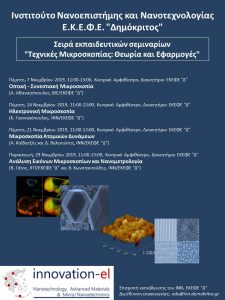 Αξιοποιώντας τις υπάρχουσες εργαστηριακές υποδομές και την εμπειρία των ερευνητών, το Ινστιτούτο Νανοεπιστήμης και Νανοτεχνολογίας του ΕΚΕΦΕ “Δημόκριτος” στα πλαίσια του προγράμματος “Innovation-EL” διοργανώνει την σειρά τεσσάρων εκπαιδευτικών σεμιναρίων “Τεχνικές Μικροσκοπίας: Θεωρία και Εφαρμογές”, τα οποία απευθύνονται σε προπτυχιακούς και μεταπτυχιακούς φοιτητές καθώς και στο επιστημονικό προσωπικό Ερευνητικών Κέντρων και Πανεπιστημιακών/Πολυτεχνικών Σχολών.