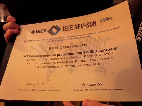 The team of the Media Network Laboratory (MNL) of the Institute of Informatics & Telecommunications participated in the IEEE NFV-SDN 2017, in Berlin, where our project SHIELD (Securing against intruders and other threats through an NFV-enabled environment) made a technical demonstration (demo) and won the Best Demo Award.